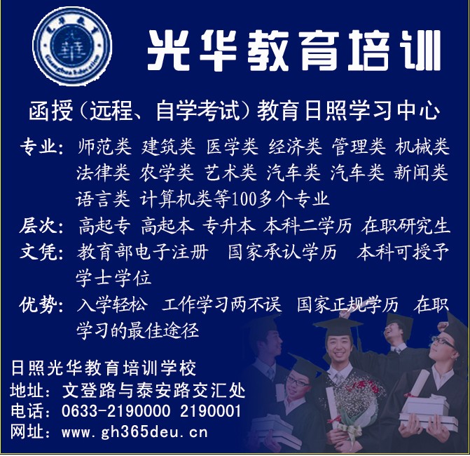 日照光华教育培训学校(日教民字【371102700058】号)成立于2003年,是经日照市教育局批准成立的正规教育机构,是日照市人事局专业技术人员继续教育基地,现已发展成为日照地区最大的成人在职教育平台,这里是哈尔滨工业大学、青岛科技大学等十余所知名高校日照地区学习中心,上千在职人员通过全国成人高考、远程网络教育和在职研究生教育完成了学历升级,事业迈上新的台阶。 光华教育以多元化的教育模式和完善的在职培训项目为在职人员继续深造、个人提高提供了良好的平台。2008年4月济南光华教育培训学校成立,学校业务范围开始向全省扩展,此后分别在济南、青岛、淄博、潍坊等地设立分校,这标志着学校进入了全新的发展阶段。 光华教育的成功得益于优秀的企业文化和全体员工的不懈努力,诚实守信是我们的立身之本,为学员提供专业、优质的教育服务是我们矢志不渝的追求,恪守道德行为是我们永不放弃的准则,我们坚信,无论现在还是将来,光华教育永远是你最忠诚的伙伴、最可信赖的朋友。
