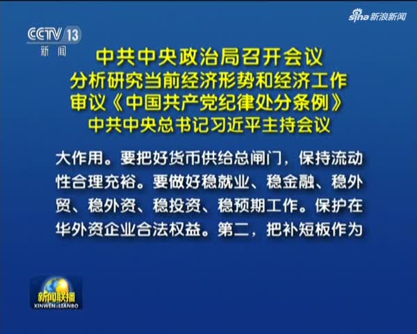 原标题:(时政)中共中央政治局召开会议 分析研究当前经济形势和经济工作 审议《中国共产党纪律处分条例》