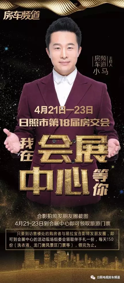 房车频道专门制作了房交会主持人代言的易拉宝,只要到访售楼处(兴业·梦想成真花园、玉兰花园、安泰·名筑(动态 图库 户型)、海洋·新城里(动态 图库 户型)、巴黎名城(动态 图库 户型)、蓝天·尚东区(动态 图库 户型)、浮来春公馆、裕升·华庭(动态 图库 户型)、锦华广场(动态 图库 户型)、赛福特·欧园(动态 图库 户型)、东辰健康智慧城(动态 图库 户型)、发达·紫钰花园(动态 图库 户型)、永利国际(动态 图库 户型)、日照港一区、城投·桂花园、金杉·西城华府、万邦城(动态 图库 户型)、长信·书香河畔(动态 图库 户型)、怡海宜家)的购房者与易拉宝合影转fa朋友quan,即可到会展中心的活动现场组委会领取伴手礼一份,每天150份(龙门崮景区门票一张和固洁洗衣皂一块),领完为止。