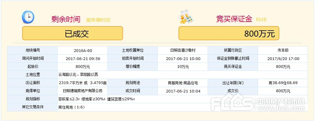 2016A-60地块位于云海路以北、萃阳路以西,出让面积2319.7平方米(3.4795亩),规划用途为商服用地·商品住宅,出让年限商业38.69年,住宅68.69年,最终以800万元底价成交,竞得单位为日照德瑞房地产有限公司。