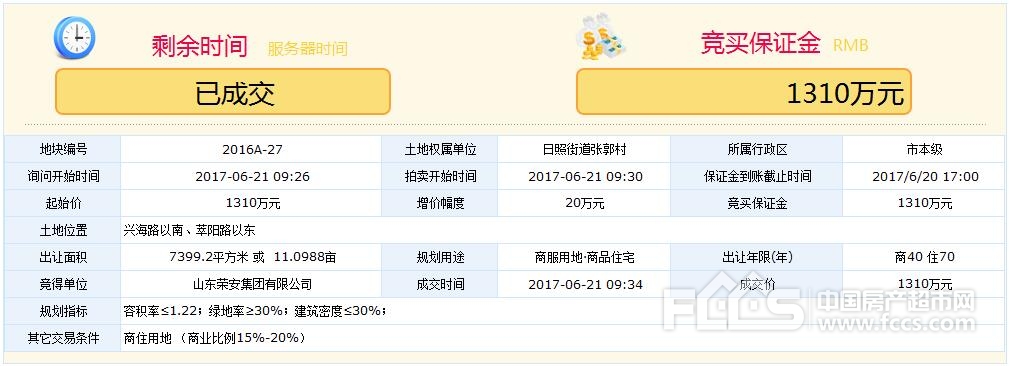 2016A-27地块位于兴海路以南、萃阳路以东,出让面积7399.2平方米(11.0988亩),规划用途为商服用地·商品住宅,出让年限住宅商业40年,住宅70年,最终由山东荣安集团有限公司以1310万元底价竞得。