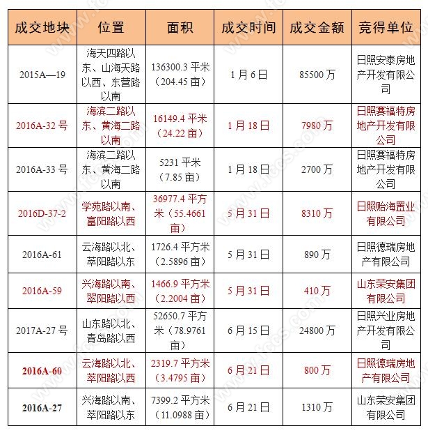2017年上半年的热点地块为2015 A—19地块,该地块位于海天四路以东、山海天路以西、东营路以南,经十余轮激烈竞价,最终由日照安泰房地产开发有限公司收入囊中,即当前的安泰·悦湖湾,总成交价8.55亿元,溢价5500万元,该地块成交价占上半年土地总成交价的大半份额。