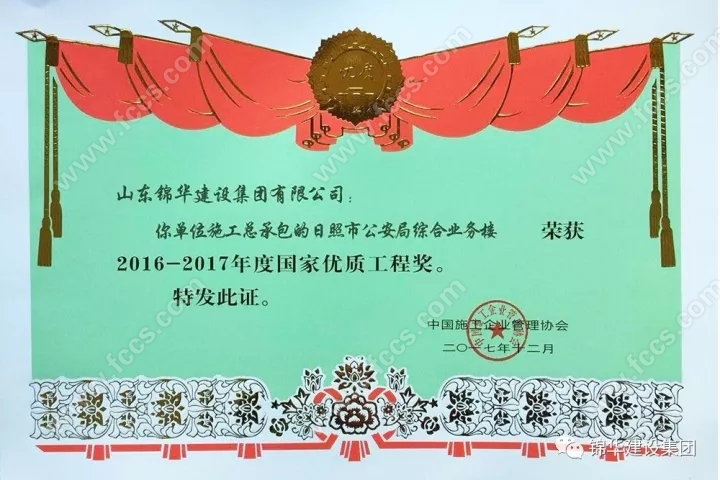 截至目前:锦华集团凭借1项鲁班奖,1项“建国六十周年全国百项经典暨精品工程”奖,2项主承建国家优质工程、1项参建工程国家优质奖、2项“中国安装之星奖”、2项“全国工程建设安全生产标准化工地”的良好成绩,成为目前日照市建筑业获国家优质工程奖励数量最多的建筑业施工企业。