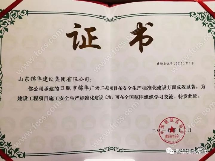 同日,中国建筑业协会建筑安全分会2017年会暨理事会在武汉召开。会上,锦华建设集团开发、承建的锦华广场二期工程在安全生产标准化建设方面成效显著,被表彰为:建设工程项目施工安全生产标准化建设工地。